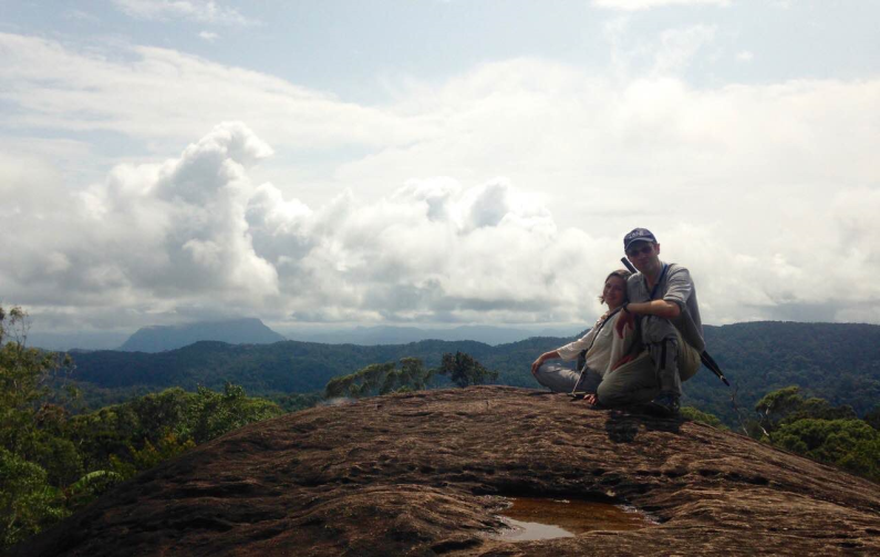 About two weeks ago Logan and Blair’s former professor, Dr. Mark Ashton, came for a visit. With him, he brought four prominent Sri Lankan professors of ecology and several students, as well as several local villagers who have been involved in their conservation projects and research over the years (Fig. 3a). Our new home bustled with activity and we set out into the forest to learn and get acquainted. We were given a crash course by Sri Lanka’s preeminent forest ecologists covering a huge variety of plants, local ecosytems and culture. We toured home gardens, climbed a few small mountains (Fig. 3b), and made a rapid descent down an overgrown forest path in a monsoon- like downpour (Fig. 3c).