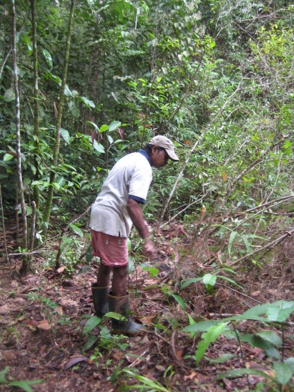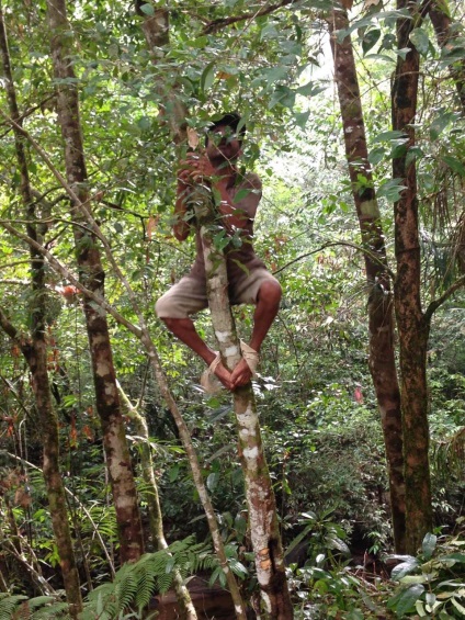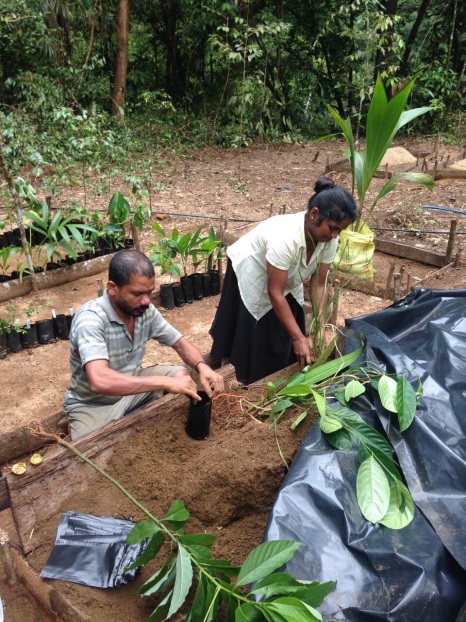 Sanskrit) are filled with small-scale gem miners and merchants. We also came across a few polybags scattered amongst the leaf litter – apparently ours isn’t the first nursery to be located here! In terms of light management, we cut a few large branches of adjacent trees that blocked light to the ground where our plants will be located. Our closest neighbor, Tillekaratne, and his climbing skills came in handy for this (See Fig. 1). Within seconds of deciding what to cut he had sprung up the tree, cut the limb, and slid down the trunk like it was a fireman’s pole. At ground level, we retained most of the seedlings of the late-successional trees (mostly Dipterocarps – a subject for a later posting). These seedlings won’t interfere much with light reaching our nursery beds, but will become the future forest when the nursery is eventually abandoned (hopefully after many years of good use!). Ultimately, we ended up with a 15m x 20m clearing that permits at least half of the sunlight to reach our plants. If we need to, it will be easy to expand the nursery into the secondary forest.