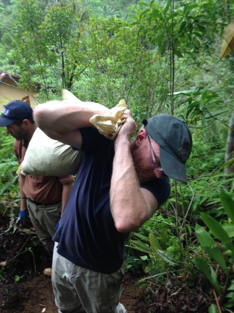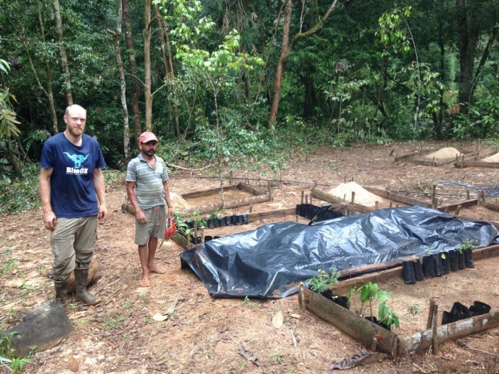 Next, to build the nursery beds, we needed some wooden boards. The plants in our nursery will be grown in polybags – 4-6” diameter, 8-10” long tubes of black plastic sealed at one end with a few drainage holes poked into the bottom. As a result, our nursery beds simply provide a structure to hold the polybags upright and make it a little easier to organize our inventory (Fig. 2). We decided on a rough size (8-10’ long, 4’ wide – for ease of watering/weeding) and set off into our forest to cut two large kitul palms to make into wooden boards (more on this in the next post: “’Shopping’ for lumber”). After moving the finished boards to the nursery we quickly built the beds: two short boards, two long boards, and 10-20 handcrafted wooden stakes to hold them in place. Within a few hours, and after some minor work modifying a nearby hose, we had 10 nursery beds complete with a central water spigot!