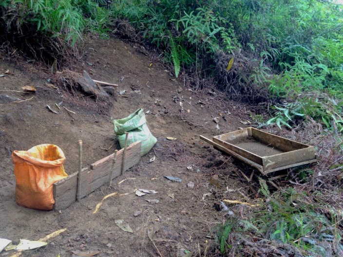 After a few weeks of getting oriented and familiarized with our Sri Lankan village life, we began work on our home garden plant nursery. For us, the nursery will be one of our primary work sites, a place where we can grow, multiply and nurture along the plants that will come to make up our homegarden, tea fields and any other forestry or agricultural project we undertake. Under the guidance of Professors Ashton, Gunatilleke, Singhakumara and our caretaker Somaratne, we selected a site for the nursery near the field station on a flat alluvial terrace next to the stream. In this location we have ready access to water and any construction materials we might need. In many ways the proper functioning of a nursery is as much a social consideration as an ecological one – we expect to visit the nursery several times a day to check on and water plants. It’s important that the nursery be conveniently located, otherwise it’s all too easy for the spontaneous nature of our day-to-day lives here to lead to neglecting the plants. Forgetting to water germinating seeds on a single rainless day could result in their demise (admittedly, rainless days seem rare here in the “rainforest”). After a rough delineation of the site, we set about clearing the area. Somaratne led the way, showing us how to use the local machete-equivalents (pehiyas and katas) to cut away small trees and ferns. We chopped and raked roots with the idella, a large hoe-like tool used locally for everything from mixing cement to maintaining rice paddies. While crashing around in the bushes we found a small mine, which pretty much consists of a vertical hole in the ground, about 2 meters square. This province (Sabaragumara) is renowned for the gems buried beneath the shallow soils. Several streets in the provincial capital of Ratnapura (“City of Gems” in