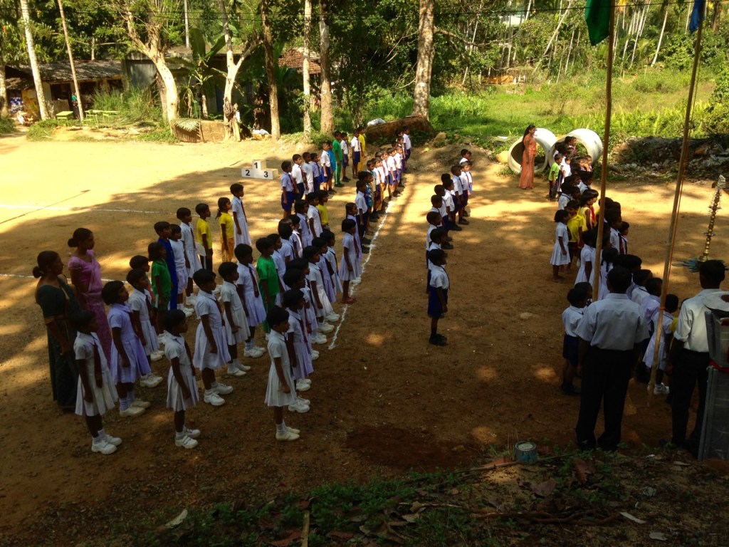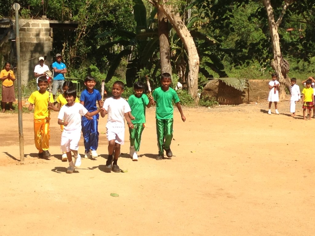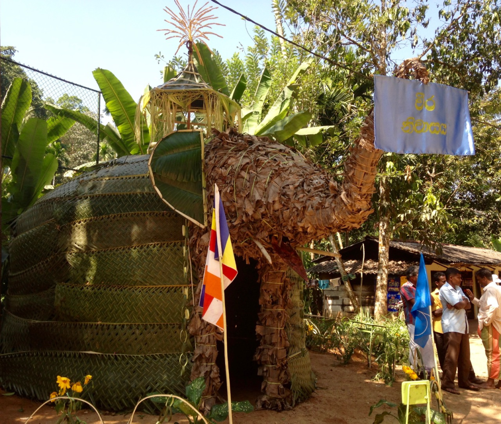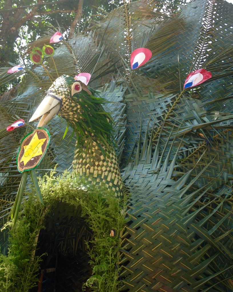 Once a year, the elementary school in town holds what we think of as a “field day” (Fig. 1). It includes races (Fig. 2), singing, a building competition, and other activities. We decided this would be interesting, so we attended, along with much of the community. The parents of the children build the houses the night before and are judged partly based on their inclusion of traditional techniques and representative traditional practices (like the way the rooms are set up and the tools they include in the kitchen). The houses were impressive (see Fig. 3) One team built a house-like house, another built a peacock house (Fig. 4), and the third built an elephant house! (Fig. 5). We loved seeing the palms, bamboo, and bananas used to make these structures. The children were also impressive and quite cute!