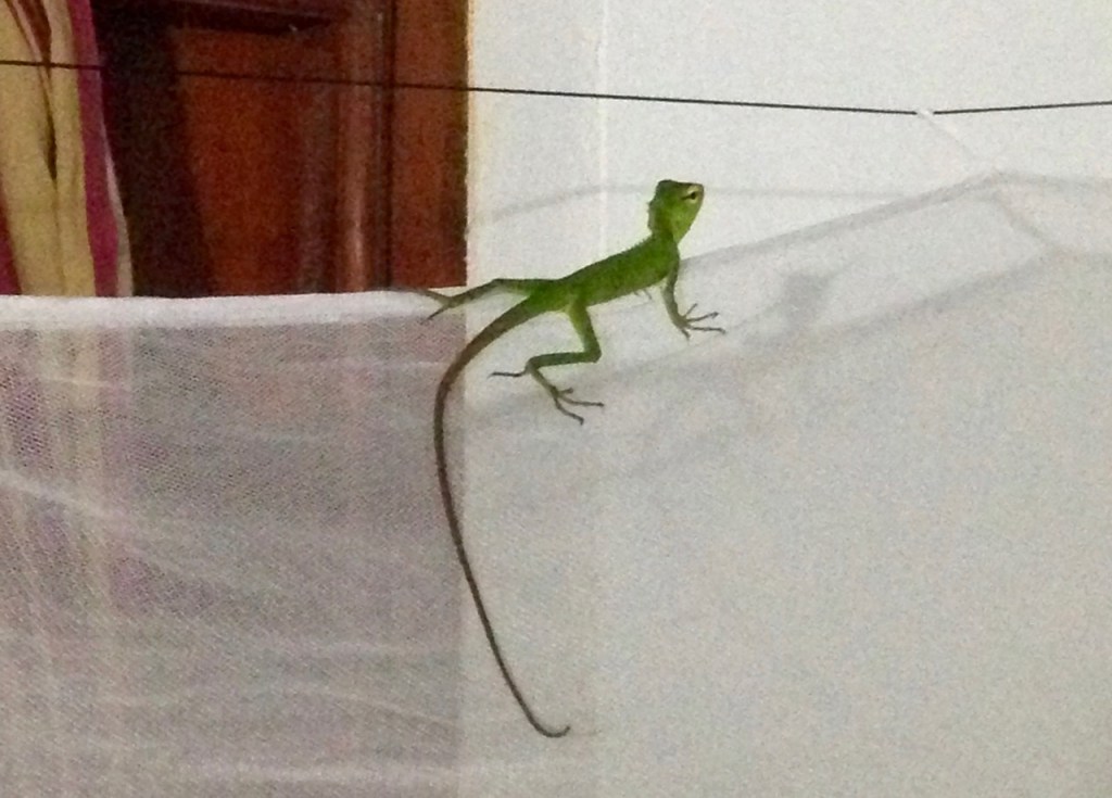 A few days ago, we found two lizards hanging out in the field station. One of them left later that day, but the other took up camp on top of our bug net! After the first night, we decided maybe he would like to be our pet, so we started feeding him bugs that we found around. So far, we have given her a couple of cockroaches and a beetle. She’s been here for 3 nights! I’m sure one day, she’ll choose to move on, but for now, her life seems pretty cush.