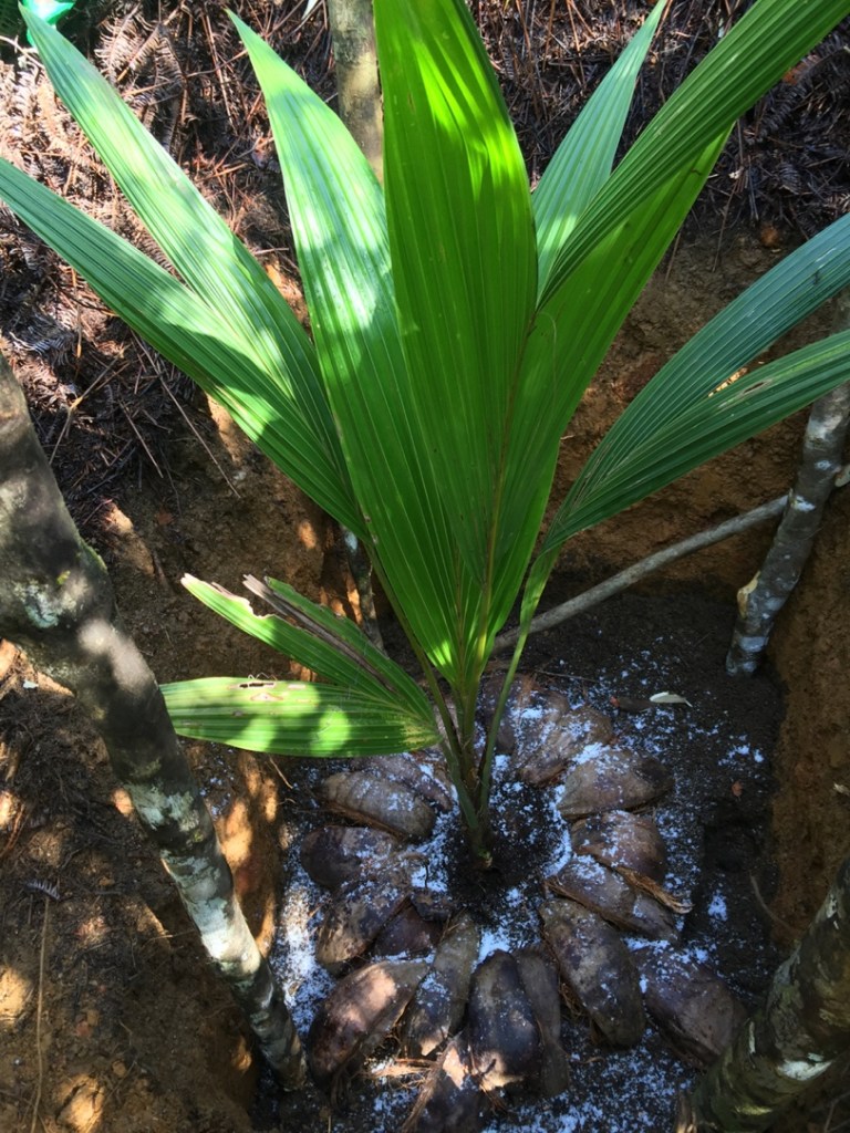 But it doesn’t end there. The very same CRISL recommends that you line the base of the pit with two layers of coconut husks. These must be hauled to the holes, in addition to even more coconut husks that will be used as mulch when the planting is finished. So after lining the hole with a layer of husks, followed by dirt, followed by a second layer of husks, you arrive at the point where you can fill the hole with soil.