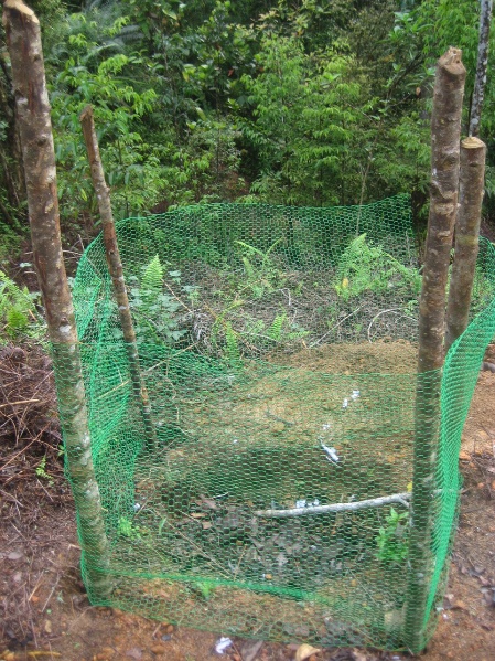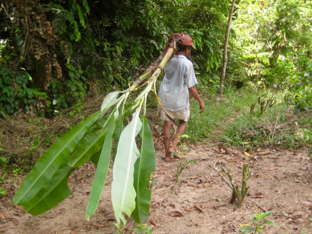 The main challenge to planting bananas at the field station is the poor, droughty soil. Almost everywhere I’d like bananas to be, we have rocky subsoil, exposed during the construction of the field station that is far too nutrient and moisture poor for such a hungry herb. Our local friends report that they would never grow bananas in a few of the locations we’re attempting to, though I have seen large, apparently successful plants on similar patio areas in some of our neighbors’ homegardens. Shortly after arriving here last fall we planted a few bananas next to our patio in an area with this subsoil – after 5 months a few have died and the rest have grown a few small leaves – not nearly good enough results for a “demonstration homegarden.” To get around this, we’re excavating large holes (2-3’ around, 2’ deep) and filling them with a rich mixture of decomposed leaf litter, topsoil from the forest edge and kekila fernlands, and compost purchased from the closest town (Kalawana). It’s not a perfect solution, but with repeated applications of mulch and compost I believe it will support the plants enough for them to grow and produce fruit (Fig. 4 a, b). I’m hoping that over the years the soils around the bananas will slowly increase in moisture and nutrient holding capacity, though I’m under no illusion that we can completely shift the development of what are surely some of the poorest soils in the valley. Also, in a few years the locations of these bananas could be suitable spots to locate fruit tree seedlings, with somewhat improved soil conditions and a good microclimate for establishing a tree.