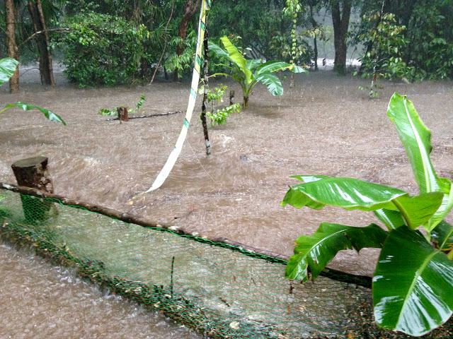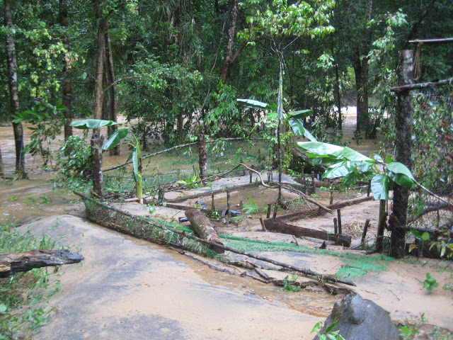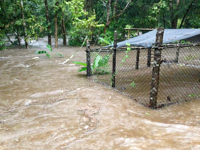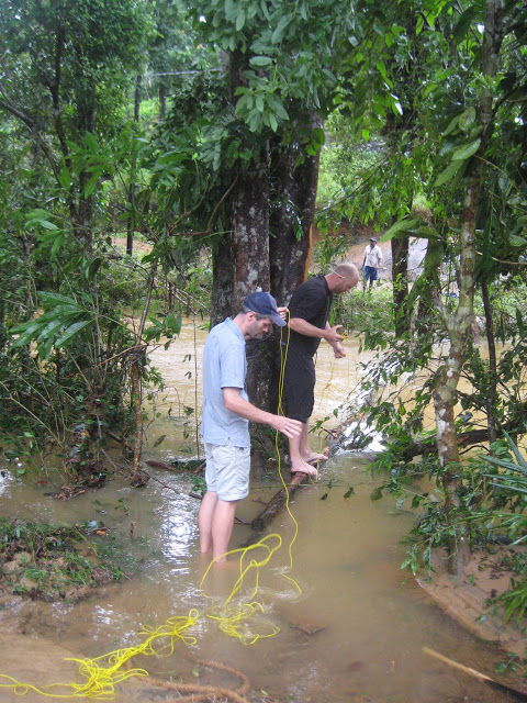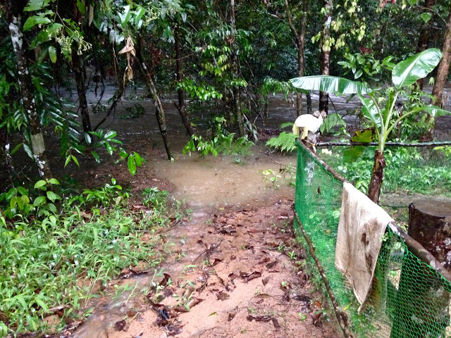 The anxious talk around town began, however, when one day it rained all day long with several heavy downpours. Our caretaker told us that our little bridge might be overtaken by the river and that the radio forecaster had predicted the rains to continue. With the previous rains, the ground was already fairly saturated, and with water pouring out of the mountains in Sinharaja, the river had begun to rise. By midday, on May 25, it was clear that not only was our bridge going to be topped (stranding us at the field station), but the rain was going to continue and cause flooding. It looked like we weren’t going to make it out to dinner at a friend’s house, like we had planned…