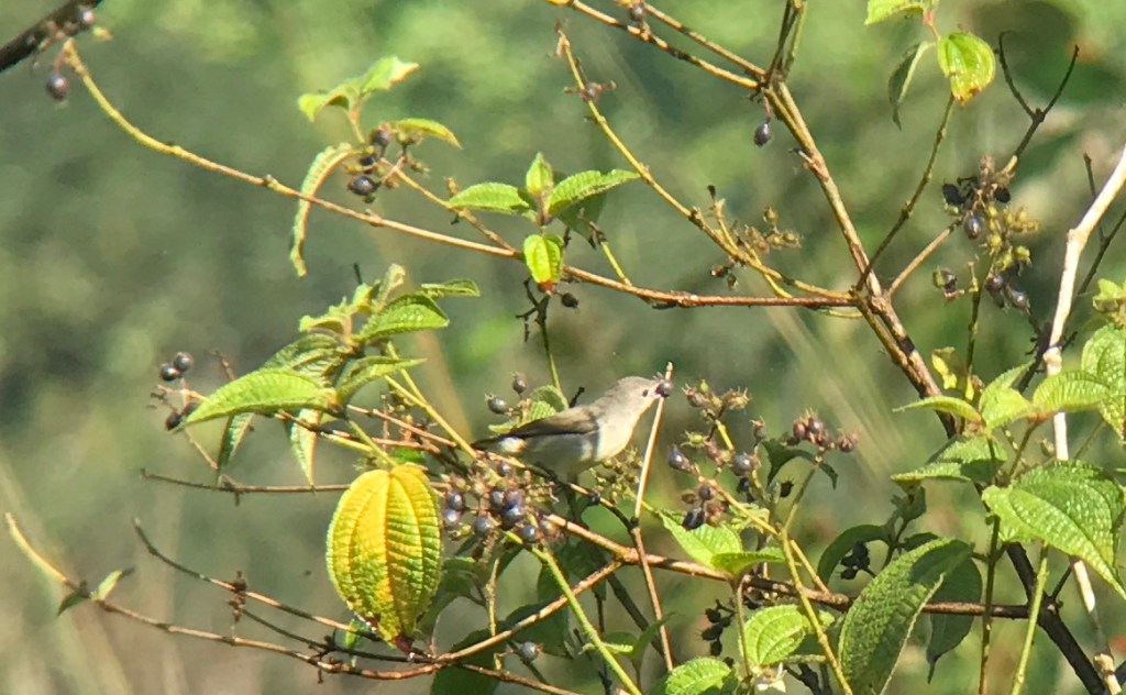 Suresh told us that the blue magpie is shy because of a banding program. It’s bold at the research station. They pluck at the caterpillars we haven’t pulled from the bananas. They move strangely, leaping lightly but forcefully, bouncing up trees. In pairs, the magpies are in body conversation with each other. One hops higher than the other and then is leaped in turn. They cross to a new tree. This private conversation takes place within its in-flock movements–a softer, larger negotiation. The flock birds all move in hopscotch: minivets, small oriole-colored birds that pivot and dive, bulbuls that cut straight lines from tree to tree, flowerpeckers that swing quickly (Fig. 1), and babblers that sail wings flared, tented.