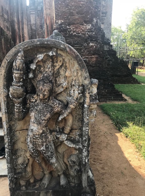 Our first stop was the “Cultural Triangle,” which is how the three ancient capitals of Sri Lanka – Anuradharapura, Polunnaruwa (Fig. 2), and Sigiriya – are known. In northern Sri Lanka, there are old conservation forests of planted mahoghany and eucalytpus, the leaf monkeys have silver rather than black hair, and elephants and water buffalo are often spotted along the roads and bathing in the many lakes of the elephant corridor in Minneriya National Park. In contrast to Pitekele, landholdings are larger and are commonly leased from the government rather than held as freeholds because farmers cultivate rice, grow vegetables or fruits or coconuts for the market. There are fewer tea plantations and more tourists. On the image houses (which house images of Buddha) outside of the 1000-year-old stupas in the ancient cities are figures and engravings which reflect the imagery of Southern India; at the lotus-covered feet of the huge reclining Buddha carved out of stone in the incredible Dambulla cave temple is Lord Vishnu. Many of the stupas reflect not just the architecture of South Indian temples but also the temples of Southeast Asia (Myanmar and Cambodia). Everywhere we go, people are surprised that an Indian speaks some rudimentary Sinhala.