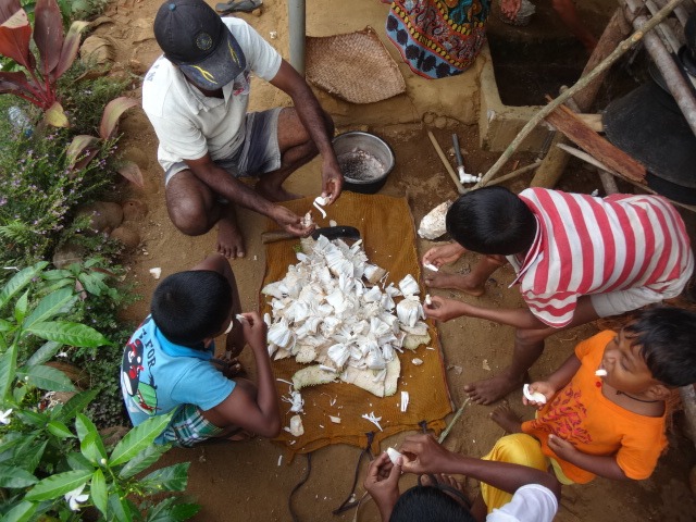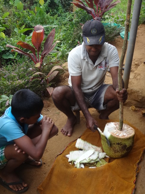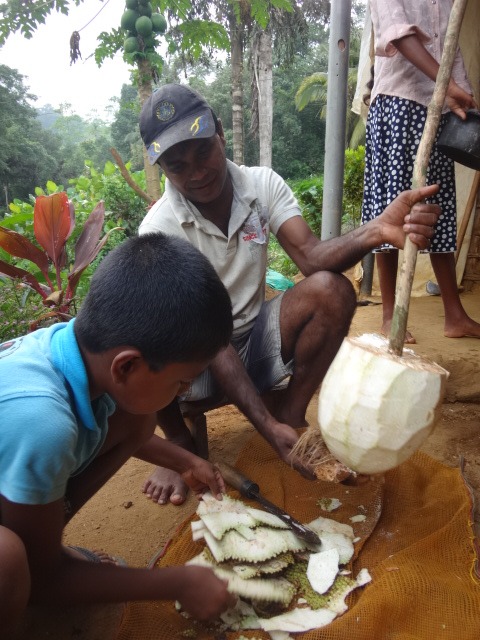 I recently had the chance to help some friends prepare jackfruit (Artocarpus heterophyllus), for dinner; a laborious process that included lots of laughs, a sticky mess and a tasty end product (Fig. 2). Jackfruit is a tree in the fig family, native to South India and now planted widely across the world. The tree has many, very tiny flowers borne together and pollinated by midges, that then develop into one large multiple-seeded fruit that was originally dispersed by a variety of mammals (rodents, giant squirrels, monkeys, wild boar and elephants). The big fruits are borne on the trunk and, when ripe, just fall to the ground. In Sri Lanka, every home garden has a jack tree to provide a continuous source of food from the fruit and as an important timber tree for house construction. It has been cultivated in Sri Lankan home gardens for thousands of years. People here LOVE jackfruit, or “Kos”, in Sinhala. The fruit is actually eaten at three different stages of maturity, each of which is pretty tasty. “Waraka” refers to the fully ripened fruit, which is eaten raw and is incredibly sweet (in a juicy fruit gum kind of way). “Polos” or “baby jak” as it’s affectionately called, refers to the young and unripe, but more tender fruit, which is often chopped into segments and cooked into a richly spiced curry. Super good. The very large, but still unripe fruit is called kos, and is often boiled along with the seeds and turned into a sort of starchy mash mixed with “gam miris” (black pepper), “miris” (fresh chills), and “sudu lunu” (white onion). This is a very common dish that I’ve come to love but had no idea how much work it was to prepare until now!