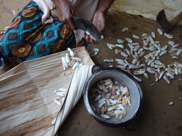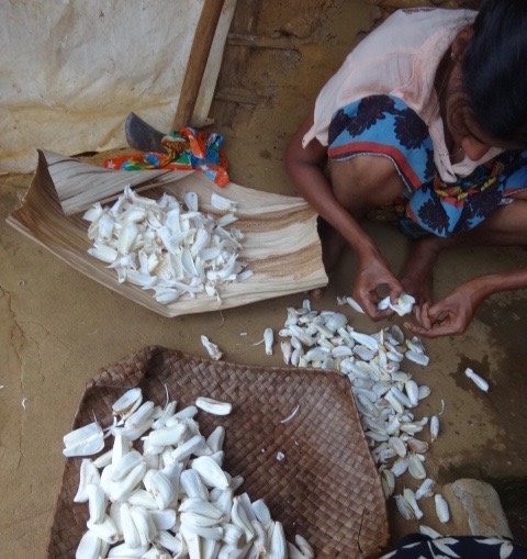 The whole preparation takes about two hours, and it helps to have several pairs of hands on-board. Fortunately, several kids from the houses next door came to help, just for the fun of it. First, we cut the green armory skin away from the fruit; a process that results in the release of an incredibly sticky white latex, which is removed with the aid of a coconut husk. Then, the fruit is cut in half and the dissection process begins, which in this case means about six people digging into the fruit and tiny shreds of kos flying in all directions. A large part of the jackfruit consists of rubbery stringy tendrils which surround the fleshy arils which enclose the seeds. We all stood around the pile of fruit and helped separate the arils from the rest of the fruit matter. This stringy part is discarded, although everyone seems to enjoy snacking on a bit of it during the process. Before beginning the next part of the process, everyone needs to wash their hands with coconut oil to remove the sap. If you don’t, your fingers just stick to one another and you can’t do much with your hands. With only the solid segments remaining now, each segment is cut open to remove the seed inside. The seeds are set into one pile and the fleshy segments in another. A very thin, hard shell encases each seed and must now be removed. The seeds are sliced in half so that we can easily peel the shell away. The shells are discarded, leaving now only the two piles of shelled seeds and the white fleshy arils that formerly surrounded them. Only after all this could we finely chop the remaining fruit into small pieces and cook them up for dinner. But hey, as one of the biggest fruits in the world, I suppose it deserves a bit of extra attention.