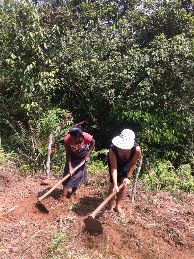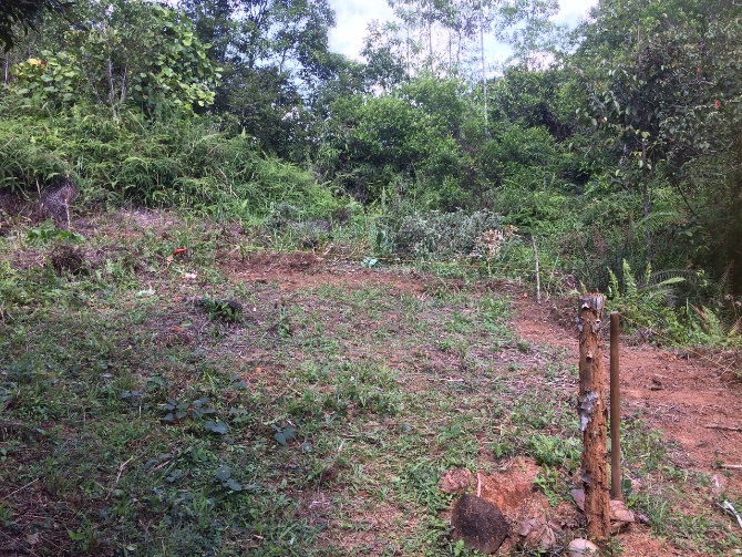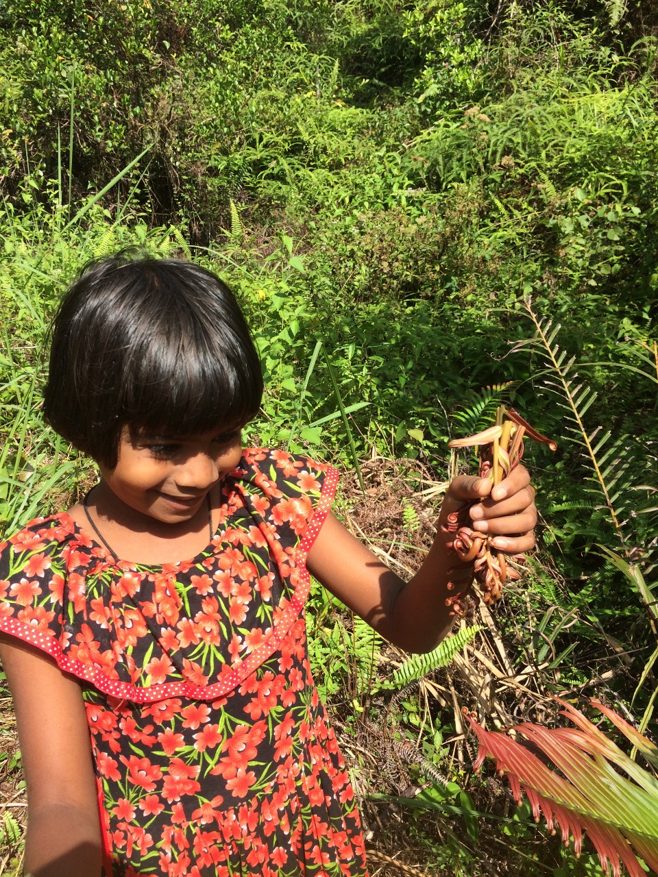It was a few full days of hard work, clearing the new space of weeds, carrying large rolls of sheet metal across the one-log bridge, cutting trees for fence posts, and digging post holes. Luckily, I think Somerathna, my caretaker and friend, took pity on me, because he brought his whole family over to help out (Fig. 4). His son Amal and I dug post holes and nailed sheet metal, while Somerathna cut down a small “keppetia” tree (Croton lacciferus – a small tree of medicinal value whose leaves are believed to be useful as natural soil fertilizer) to use fence posts. His daughter, Netmini, playfully helped with a bit of weeding, while helping her mom Piasili harvest fern fiddleheads which we had for lunch. At the end, we all jumped in the river and called it a day. It was a real family affair, and another example of how rewarding hard work can be done with pals.