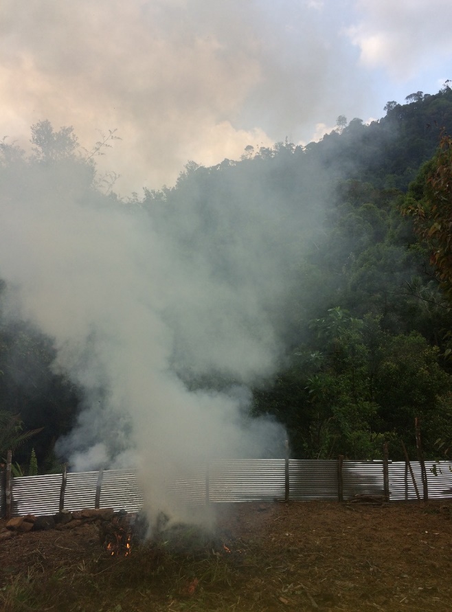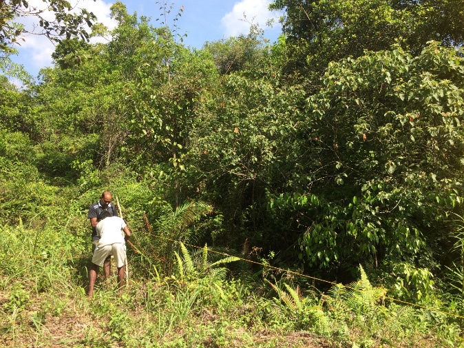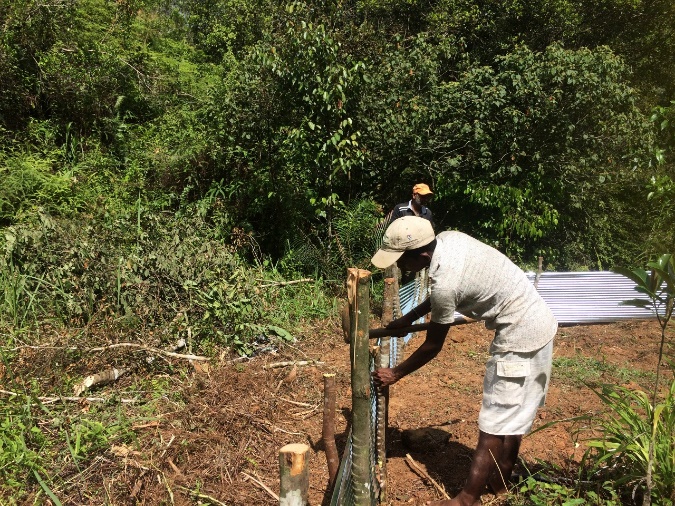 Meanwhile back at the field station, we just completed our fence! Several of the banana trees have begun to re-sprout since the ura’s (wild boar) last massacre. In order to prevent these young banana sprouts from meeting the same fate as their predecessors, we’ve fenced off the area on the north, south and west sides of the house (much of zone 1 and 2 – See prior 2016-17 Blog 8 for the home garden design). I’d seen a number of fence variations in the village, though most were used to keep the wai mia (the oh-so-cute mouse deer, who looks exactly as the name implies) out of the garden. These fences are quite attractive and made from local materials like live-stalks of larapa (Gliricidia sepium) and intricately woven pitcher plant vines (Nepenthes spp.) (Fig. 3). I thought I might try to replicate something like this, but after asking for recommendations around the village, it seemed that shiny, shiny sheet metal might be the best medium for keeping the wild boar out. Solid, durable, but so very difficult to look at in the noonday sun. Nonetheless, I decided to go for function over aesthetics in this case.