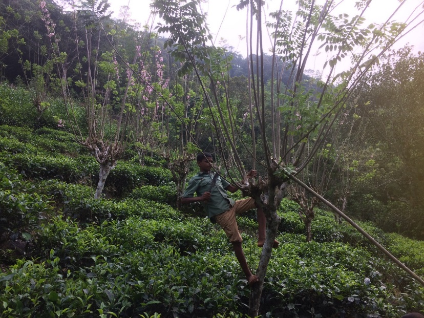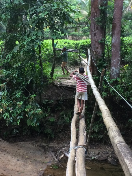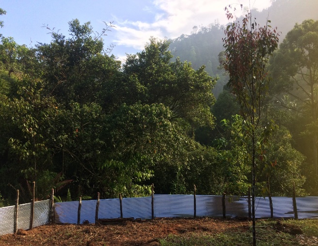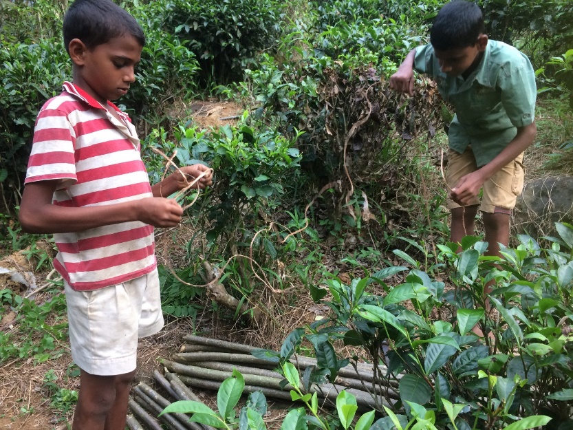 The new addition of bright metal gave the garden a bit of a stark appearance, so the next day I decided to add a bit of local flare and set out to see if I could find someone with a surplus of larapa trees (Gliricidia sepium). This is easily done since many folks plant these nitrogen-fixing trees throughout their tea plantations as a natural fertilizer. The trees are pollarded, leaving about a five-foot trunk topped by ten or so leafy branches which are periodically lopped off and left in the field to add nitrogen to the soil. Conveniently, these branches are often perfectly sized for live-stakes. After a morning of asking around, I managed to find someone nearby who had plenty to spare and was happy enough to let me harvest a few branches. Again, after seeing what I was up to, a couple neighbors jumped in to help me out. In this case, brothers Kavindu and Tharindu were enthusiastic to show me how it’s done, climbing into the tree and cutting down the branches with small machetes and lashing the pile together with bandura (pitcher plant vine) (Fig. 5). Now planted along the new fence, they’ll hopefully add a bit of organic color to the tin fortress I’ve put up. The fence still looks a little bare-bones now, but once the larapa leaves start to come in and we get a few vines growing along it, it should shape up nicely to resemble something a bit more typical to the area, and hopefully with the added benefit of being ura proof! Fingers crosses!