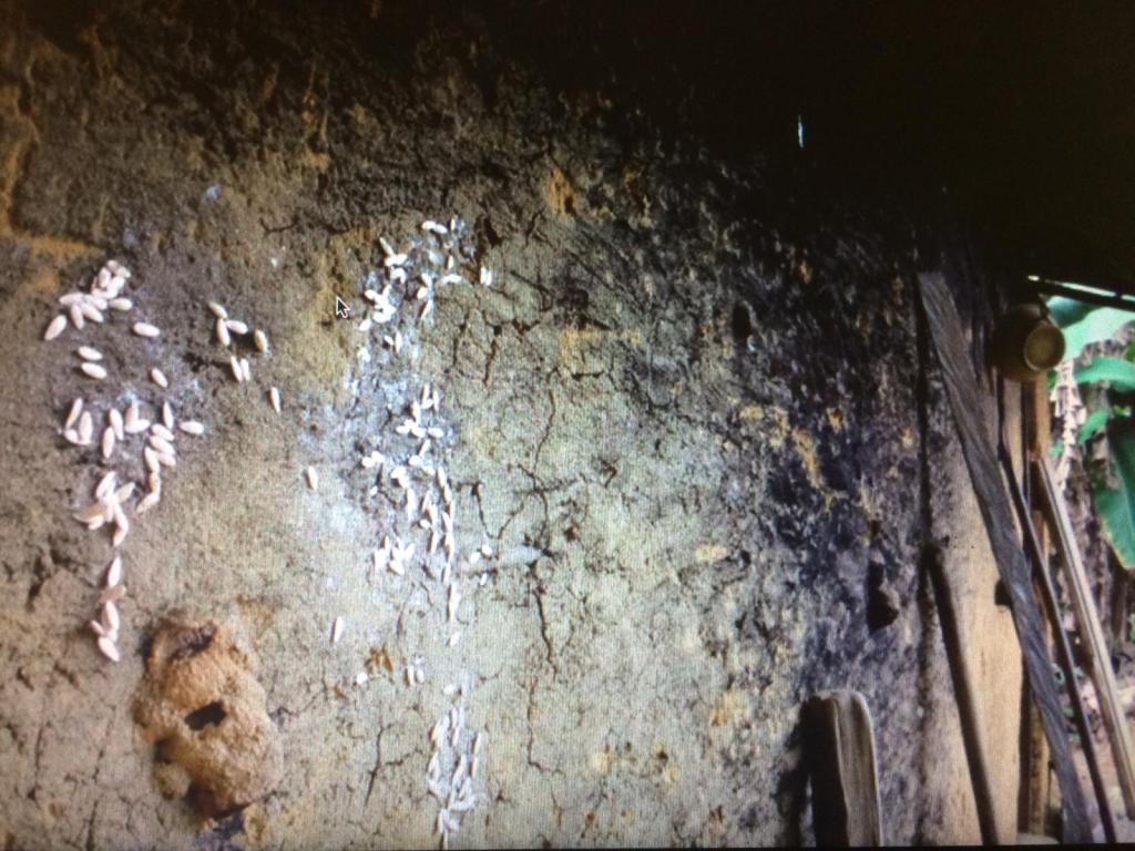 This also has interesting implications in terms of storing seeds–a practice most people in the village seem not to do. Many of the common fruit trees here have large recalcitrant seeds, not well-suited for long-term storage. Most annual vegetables and flowers produce year-round, and most perennial ornamentals are propagated by cuttings (“rikila” in Sinhala), so seeds or branches are always available from a relative or neighbor. Store bought seed packets or small seedlings are occasionally purchased to supplement the stock of annual vegetables like eggplant (wam-butu), and on one occasion I met with a woman who had pasted cucumber seeds to the side of her house to protect them from insects and ground moisture (Fig. 3). But aside from this, most other seed sources seem to be procured directly from the garden at the time of need. Each home garden acts as a live seed bank so other forms to storage are not necessary; and collectively the gardens are the store-house of local diversity. In a part of the world with high humidity and little access to refrigeration, there are many opportunities for decay. Keeping germplasm safe in their own live plants makes a lot more sense.