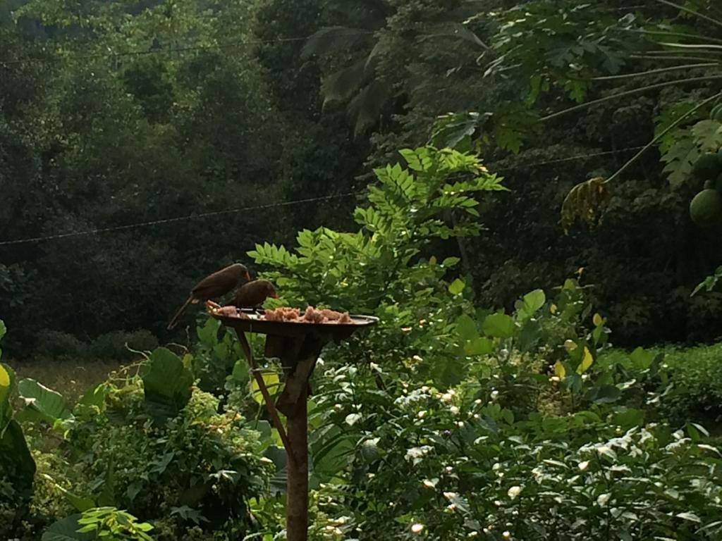 The second most common answer to the question of seed source, is that seeds are brought by birds! What a cool answer! Another relatively passive but effective planting strategy. Birds visit one garden to eat the fruit and deposit seed in another. Once sprouted, residents can decide whether to keep the new sapling where it’s landed, transplant it, or get rid of it altogether. Interestingly, in terms of genetics, this is roughly the same as the first answer, in which plants move from garden to garden. The added complexity being that birds will visit fruit trees deeper in the forest more often than people do, and so may occasionally add new genetic material into the mix. Birds are attracted to the gardens not only by the fruit of trees, but also by offerings made by people. In almost every garden is a bird feeder of sorts– a wooden post with a plate of woven bamboo or flat piece of wood anchored on top, upon which leftover rice and fruit scraps are offered to the birds and squirrels (Fig. 4). If someone is eating a banana or orange they’ll often toss a chunk of it up onto the bird plate. I find this really interesting because this is also a strategy used in tropical forest restoration– erecting bird or bat feeders on degraded land to recruit seed sources brought by birds or other flying animals. I haven’t yet figured out if there’s a deliberate connection here, but feeding the birds is definitely an important ritual for many folks in Pitakele. One woman in the village left town to visit her mother and upon returning, had much to say about her husband having let the birds go hungry in her absence.