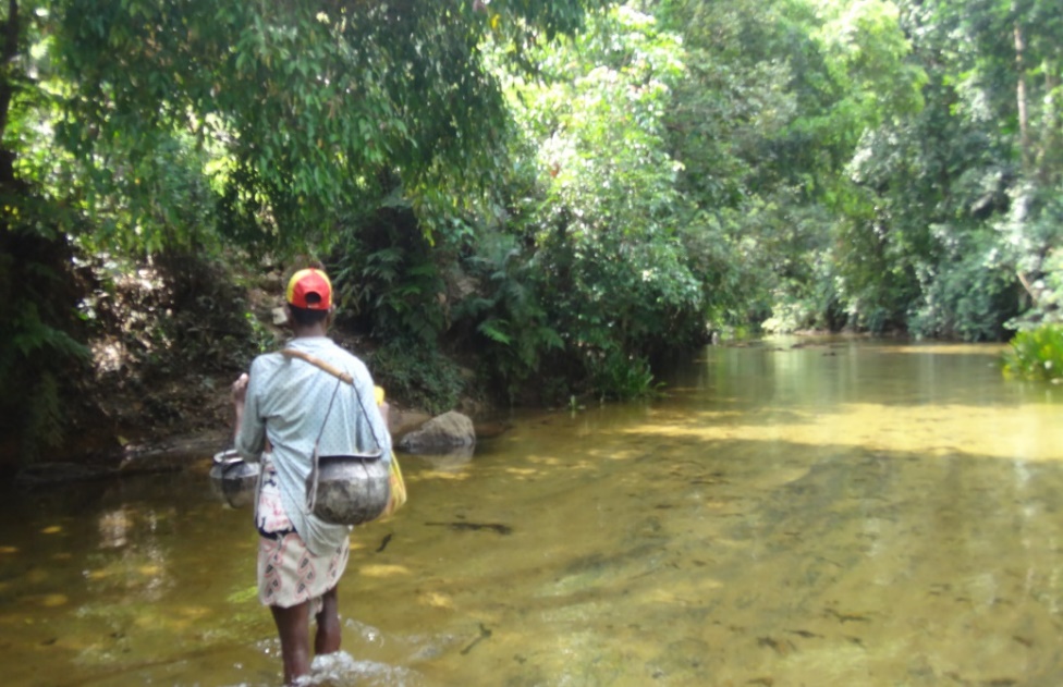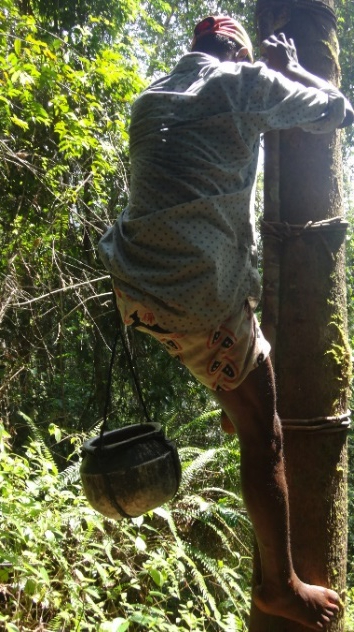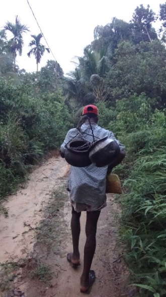 With a full sack, we’ve now got to get back to the kithul trees before last night’s collection jugs overflow (Fig. 7a). So we hightail it to both palms, eat a quick breakfast by a stream, and make our way back out of the forest. The contents of our day of foraging comprises sweet tree saps and wild mushrooms. It gives me that northeastern feeling again and I think back to agroforestry schemes of sugar maples over shiitake mushroom understories. Two universally luxurious non-timber forest products. We cross the river (Fig. 7b) and back into Pitakele. Udeyashoka with two large jugs of fresh kithul sap over his shoulder and I with the Santa Klaus-like sack of mushrooms over mine.