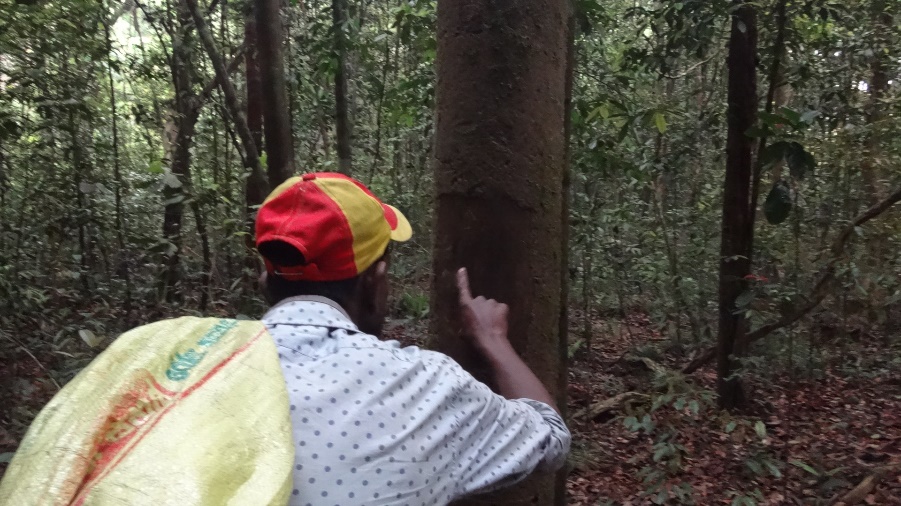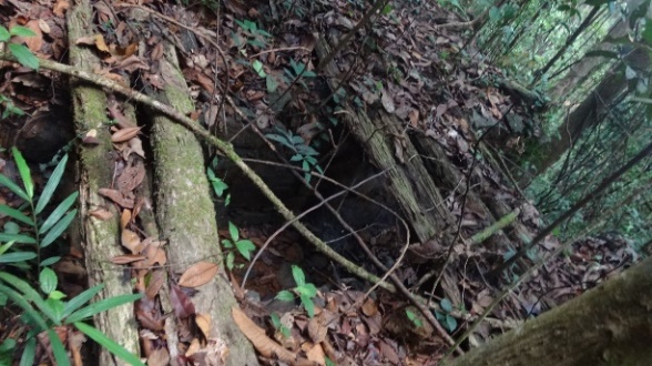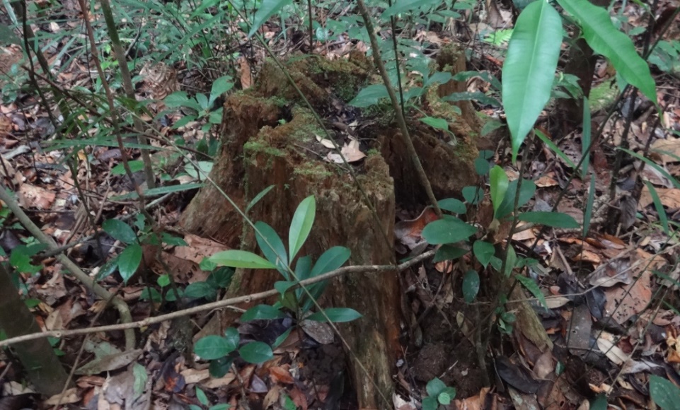 As we walk through the rainforest he points out interesting landmarks and I feel just like I’m back in good ole management plans on a trip to the Yale Myers Forest to learn the signs of past land use histories! We pass old canals dug out to guide water from streams into the rice paddies (Fig. 2 a). The paddies used to be cultivated in the villages here before tea became the main commodity. We pass old tree stumps dated before the restrictions against logging in Sinharaja forest (Fig. 2 b). We stop at the remains of several old kithul cottages, make shift one room structures with space for a kitchen and protection against the elements. Villagers built these small structures where they could boil their kithul sap down into syrup instead of carrying the heavy load all the way back to their homes (it takes about 10 kl of sap to make 1 kl of syrup). Folks here speak fondly of the old days when the whole family would spend the day deep in the forest at their own kithul cottages, boiling sap, foraging for wild herbs and mushrooms, cooking meals, and swimming in the river. Men reminisce of evenings spent in the cottages with friends, singing and drinking raa (kithul toddy) freshly fermented from their tapped trees in the forest. These days new restrictions forbid the construction of cottages in the forest. Their remains tell the story with only four standing wood posts that are all that mark the location of one cottage (Fig. 2 c). At another site Udeyashoka shows me an old grinding