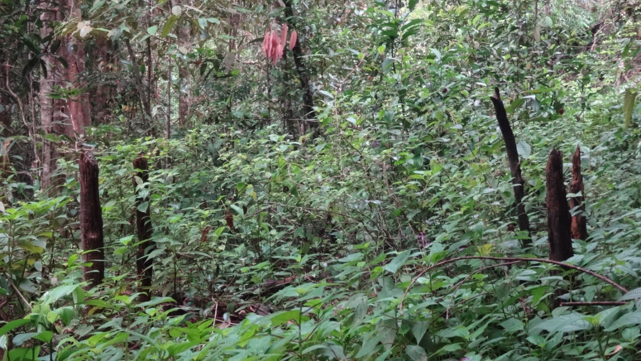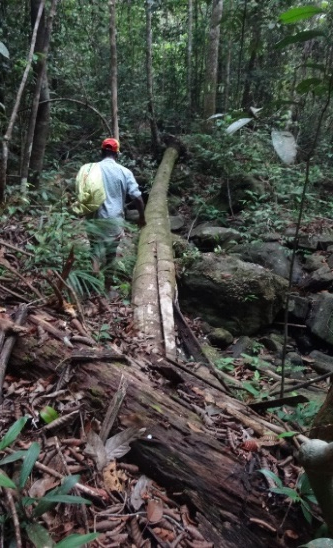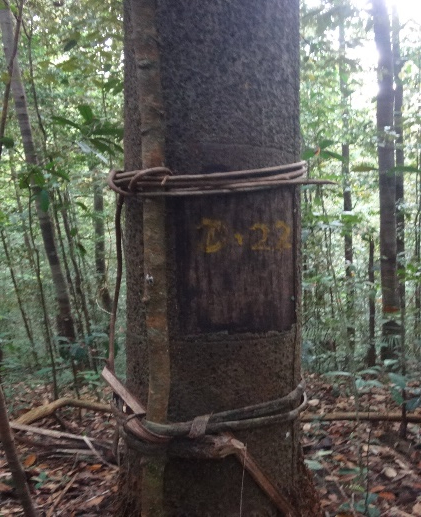 We carry on. We pause at a point in the forest which, to the trained eye is a fork in the path. To me, both the fork and the path itself are invisible, with one group of trees blending right into the next bit of patterned chaos that makes a rainforest. Udeyashoka unhinges one of the two tin jugs from the pole he’s been carrying over his shoulder and places it on the ground. We’ll be coming back this way en route to one of his kithul trees. About 20 minutes later, we approach the site of his second kithul tree and this time place the other jug on the ground right next to it. Here he shows me it’s identification number painted onto the side of the tree where bark has been scraped off. Tapping kithul trees in the forest requires a permit these days. Each tree is numbered and registered (Fig. 3 a, b). When someone identifies a tree they want to tap they must go into the main town to request tapping rights for that tree for one year. An individual can have rights to up to 10 trees, but I haven’t met anyone who taps more than three. Elephants on the other hand seem to go through a high number of kithul trees. They too are attracted to the sweet sap and the soft pulp at the center of the palm. We cross many downed kithul trees; knocked over and pried open by one of the two resident pachyderms in this corner of the Sinharaja forest. In fact, much of our journey is spent following old trails made by elephants – in areas of thick understory these are the paths of least resistance. Udeyashoka points ahead to a wide trail of crushed brush and says “we’ll go the elephant way” and we trudge on over trampled kithul and elephant patties (Fig. 4 a, b).