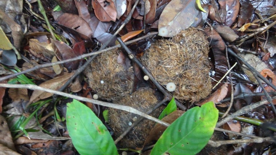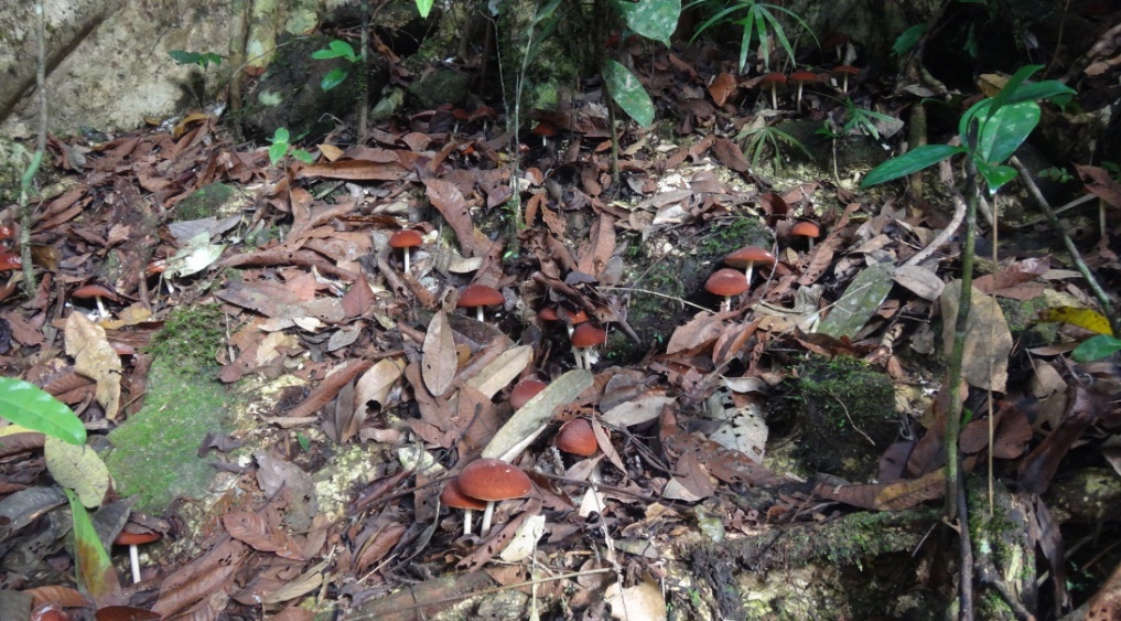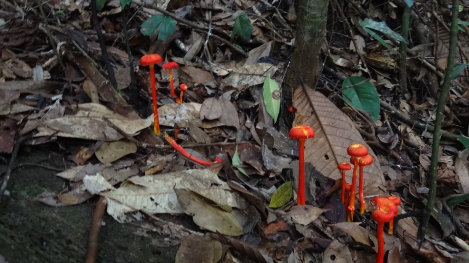 With both sap jugs dropped off we now switch our focus solely towards the hunt. We look for clues. A brilliantly bright orange mushroom isn’t the one we’re looking for, but Udeyashoka picks it out of the ground and says “information mushroom” (Fig. 5a). If these are here, the ones we’re after are close to follow. The vegetation and topography change slightly and I try to make out the differences, but there’s a lot to take in, all the while trying to pick out the leeches stubbornly wedged between my toes. When we get to the “market”, we know immediately. Not by sight but by sound.