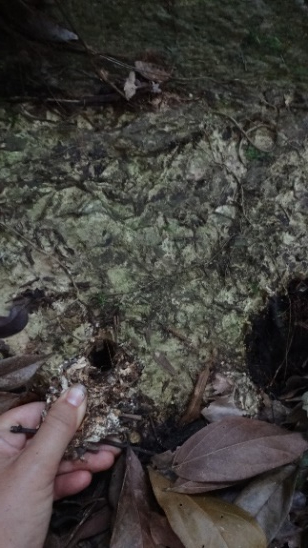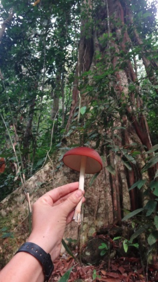 The dense network of mycelium creates a firm mat over the forest floor (Fig. 5b). It’s taut like the leather of a drum stretched over innumerable surficial roots and buttresses. It creates trapped space between the mycelium and the actual soil surface below and makes a thumping sound which resonates in the ground between me and my mushroom hunting partner as soon as we begin to walk over it. We look around and within a few steps we enter a part of the forest dotted with hundreds of little brown mushrooms (Fig. 6 a, b). I feel that same childlike grin creep over my face, the one everyone in the village has been wearing the past weeks, and we get to work. There are no restrictions or permits required to harvest mushrooms. The mycelium mats are dense and seemingly healthy and we are harvesting only the fruit. There are so many, it seems like a sustainable enough practice. But who knows. This too may change in the coming years.