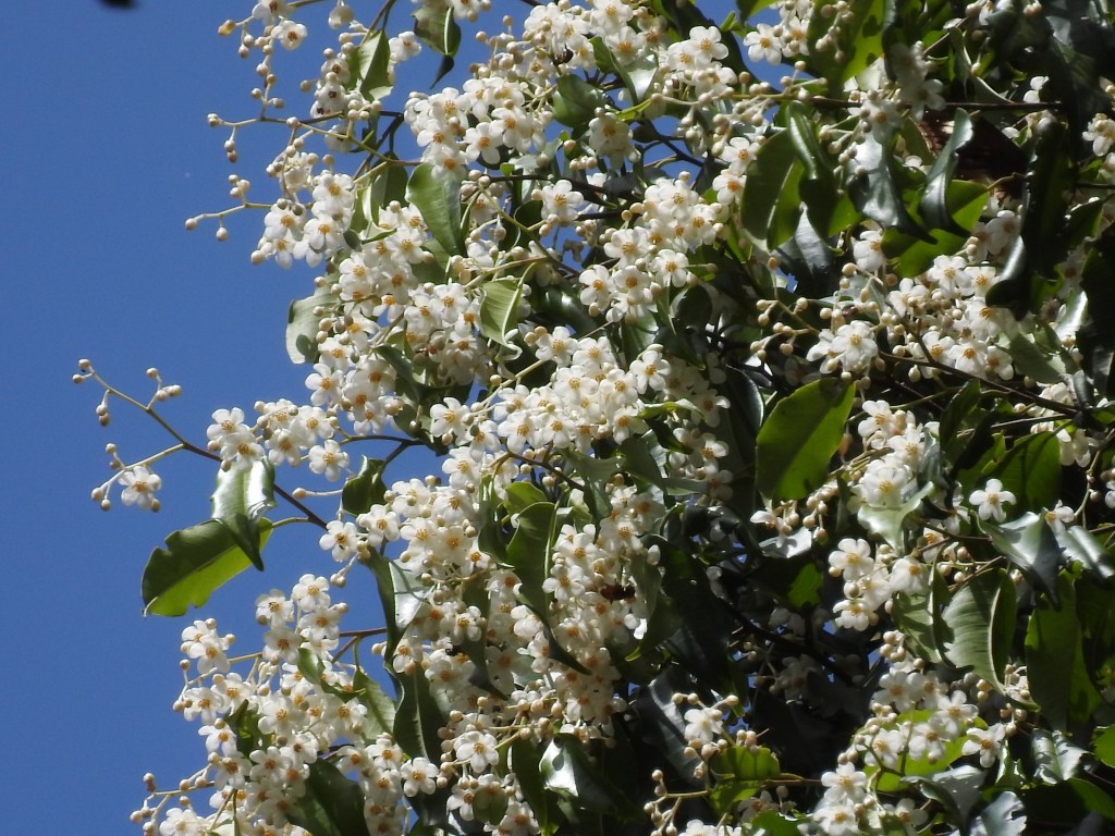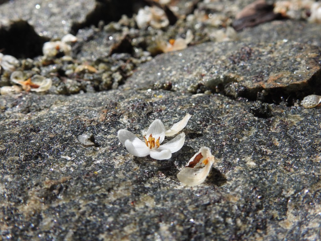 The entire flowering period is compressed into one week. Everyday during this brief period, one set of buds unfurl around 8 am, stay open for about six hours, and fall en masse like steady rain at around 2 pm. The next day, a different set of buds unfurl: at no point do all the buds in an inflorescence open simultaneously, no doubt a bet-hedging strategy to protect against chance events like torrential rain.